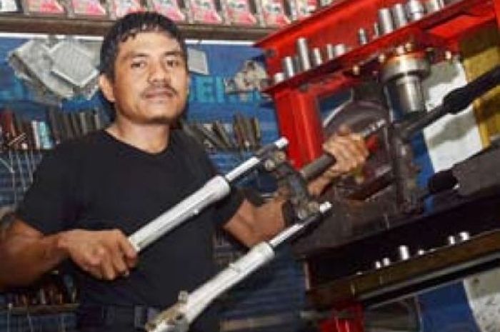 Yang ini, segitiga di motor. Nah, mulai dari segitiga yang gak center akibat menghantam lubang secara keras,hingga pacuan yang alami tabrakan pun kerap ditanggani. Setidaknya, sudah 19 tahun doi bergelut di bidang itu.