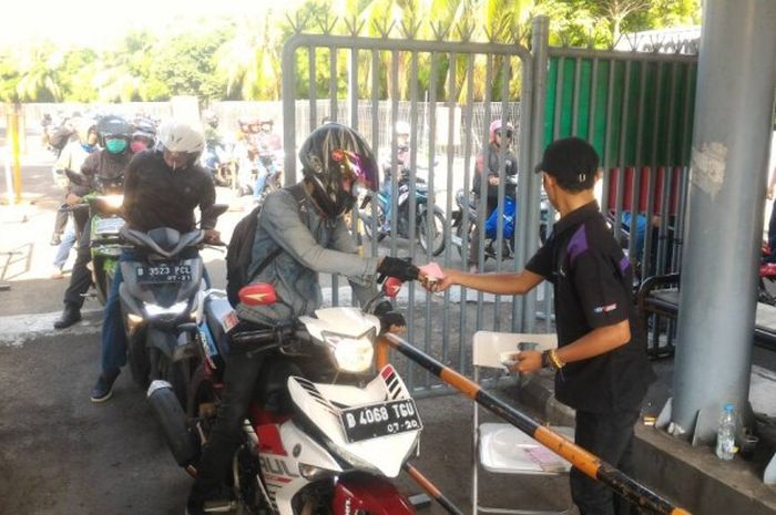 Pagi ini sudah terlihat antrian motor untuk mengambil ticket parkir untuk memasuki arena di JIEXPO Kemayoran, Jakarta Pusat.
