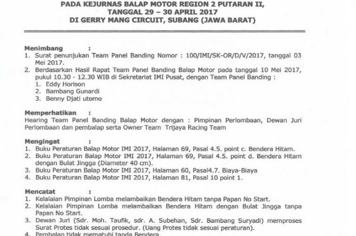 Dengan keputusan yang diturunkan oleh rapat team panel banding balap motor yaitu Eddy Horizon, Bambang Gunardy dan Benny Djati Utomo.