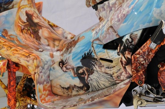 Khususnya pada seni airbrush yang ditoreh ke sekujur bodi hingga kaki-kakinya. Serem, cuy!