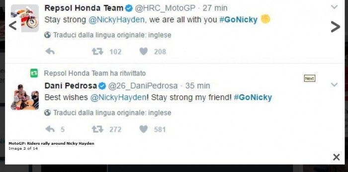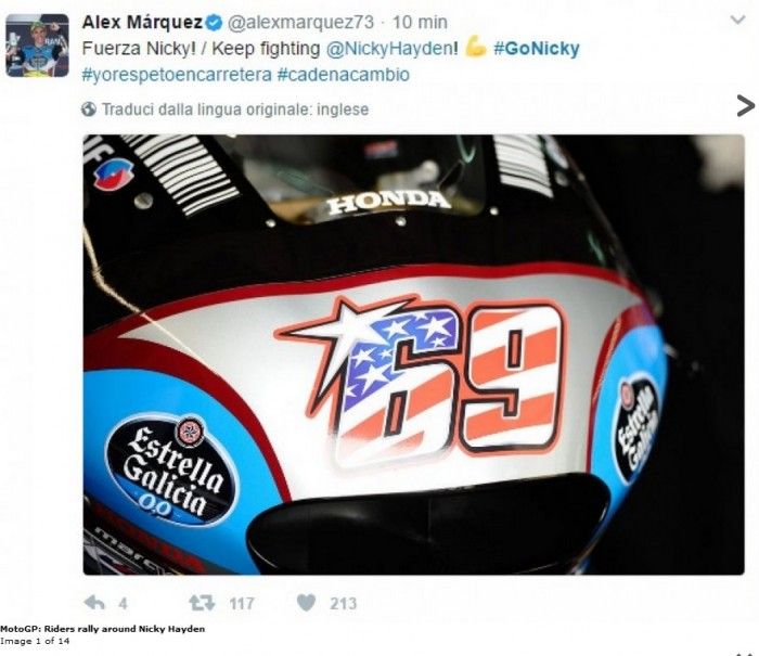 Banyak teman-temannya sesama pembalap memberikan support dan doa untuk kesembuhan Nicky Hayden, lewat sosial media, terutama pembalap MotoGP dan lainnya.
