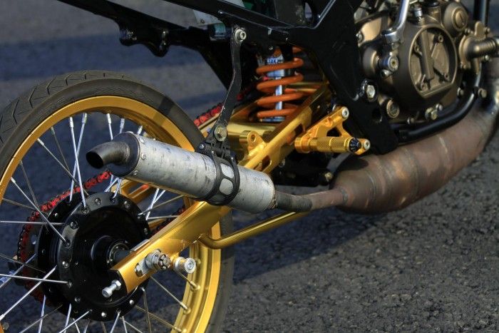 “Oprekan ini yang jadi jurus jitu. Knalpot dibikin big volume, dengan diameter perut 44 mm. Bahannya pakai plat tipis seukuran 0,8 mm. Biasanya kan pakai plat dengan ketebalan 1 mm tuh,” ceplos sang juru racik mesin yang bermarkas di Jl. Perjuangan, Wisma Asri, Bekasi Utara itu.