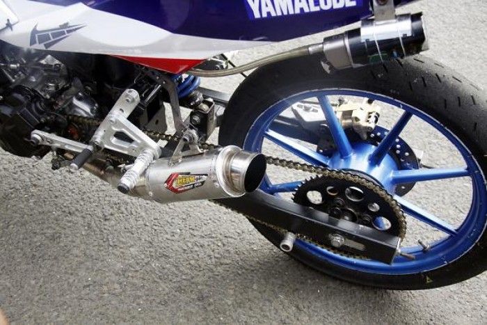 Nah, ini dia yang bikin lengkingan mesin bisa tinggi. Knalpot yang seyogyanya ada di posisi kanan, diubah posisinya oleh Gendut ke sisi kiri motor. Ubahan ini tentunya bukan asal terap. Terbukti putaran mesin bisa lebih tinggi, dan tenaga makin besar. Dari hasil dyno, mutahan power maksimumnya mencapai 31,6 hp dan kitiran mesin bisa lebih dari 13.000 rpm.