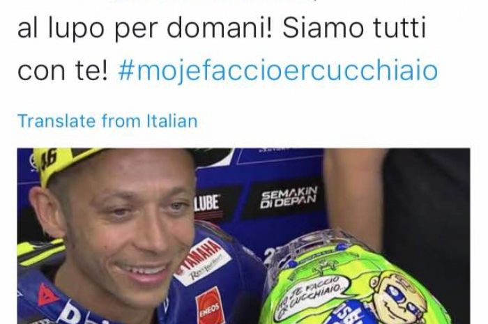 "Terima kasih @ValeYellow46, semoga berhasil besok! Kami semua bersamamu! #mojefaccioercucchiaio," tulis mantan kapten AS Roma yang sudah memutuskan pensiun dari olahraga sepakbola.
