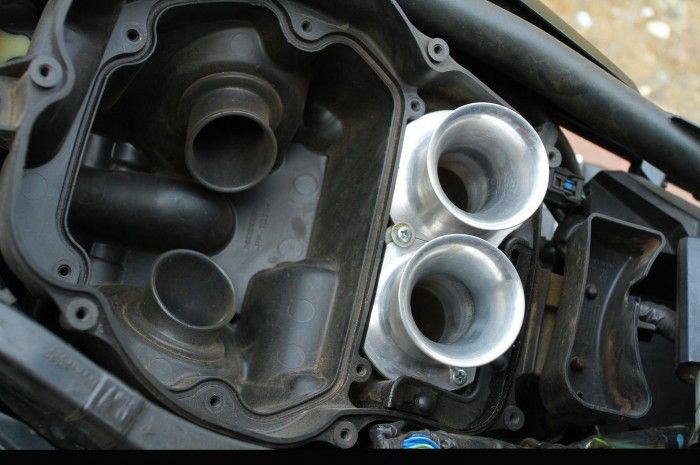 Selanjutnya, throttle body standar disematkan velocity stack.