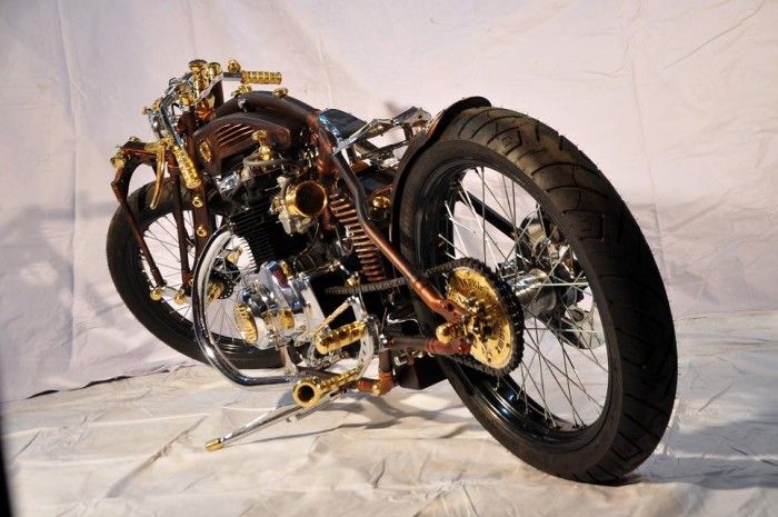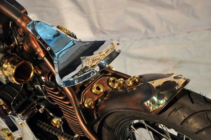 Dikolaborasi bahan kuningan dan krom di sekujur tubuh motor 750 cc ini. Ckckck..