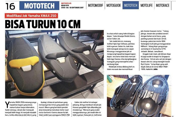 MOTOR Plus - Khusus buat pemilik dan pengguna Yamaha XMAX yang ingin merubah tampilan jok motornya, enggak salah baca MOTOR Plus Edisi 970. Pada edisi ini, semua kebutuhan informasi seputar jok Yamaha XMAX dikupas tuntas.Yamaha XMAX belakangan menjadi buruan biker sebagai pilihan matik gambot berkekuatan besar.
