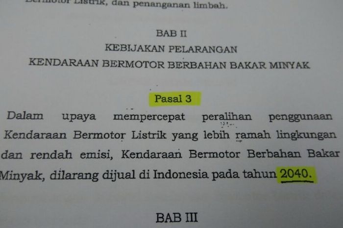 Dalam pasal 3 draft Peraturan Presiden berbunyi "Dalam upaya mempercepat peralihan penggunaan kendaraan bermotor listrik yang lebih ramah lingkungan dan rendah emisi, kendaraan bermotor berbahan bakar minyak, dilarang dijual di Indonesia pada tahun 2040".
