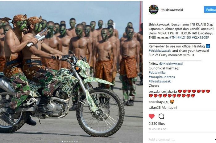 Sebagaimana unggahan di akun Instagram @thisiskawasaki, terlihat pasukan TNI tengah menunggangi motor trail Kawasaki KLX 150 dengan bertelanjang dada.