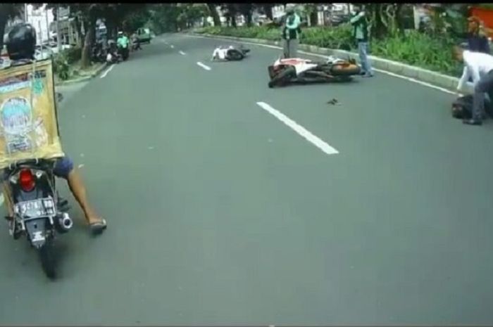 Karena kehilangan keseimbangan, motor menghantam pengendara motor wanita dan satu kendaraan lain didepannya.
