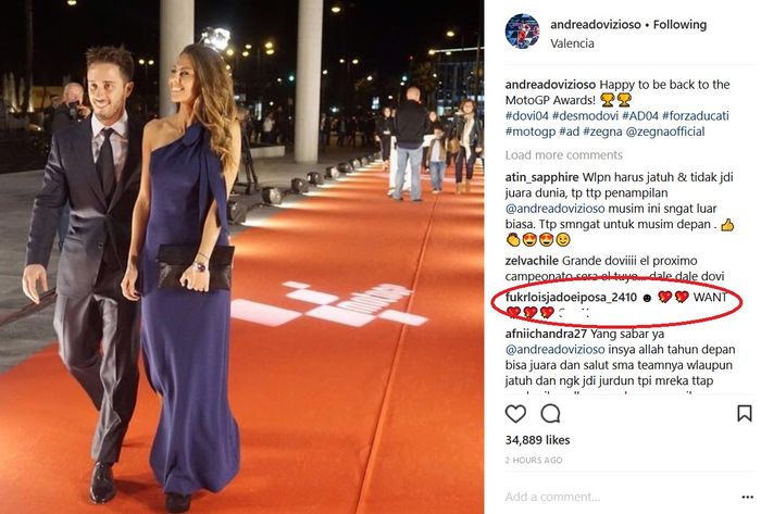 Gawatnya nih bro komen dengan akun fukrloisjadoeiposa_2410 itu saat postingan foto Andrea Dovizioso bersama Denisa istrinya jelang penghargaan FIM Award 2017.