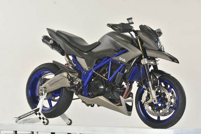 Nuansa Hypermotard memang sudah terlihat sangar. Bodi full fairing ditanggalkan dan diganti bahan fiberglass, kemudian diberi sentuhan carbon kevlar lewat water printing.