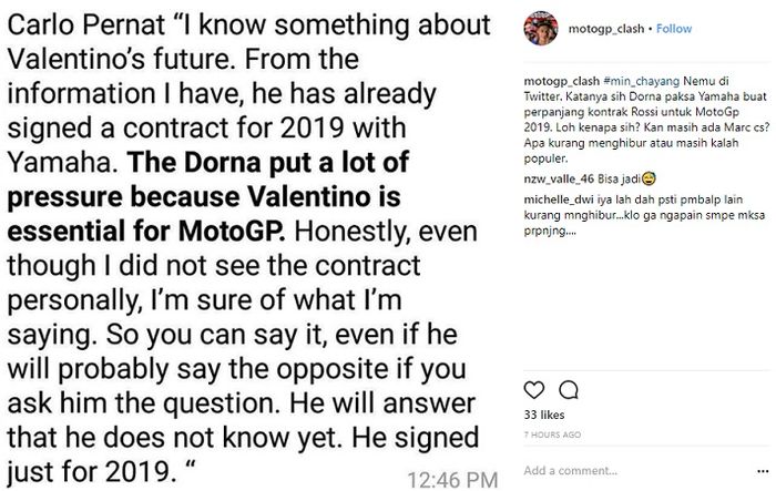 Ungkapan Carlo Pernat sendiri diunggah akun Instagram @motogp_clash.