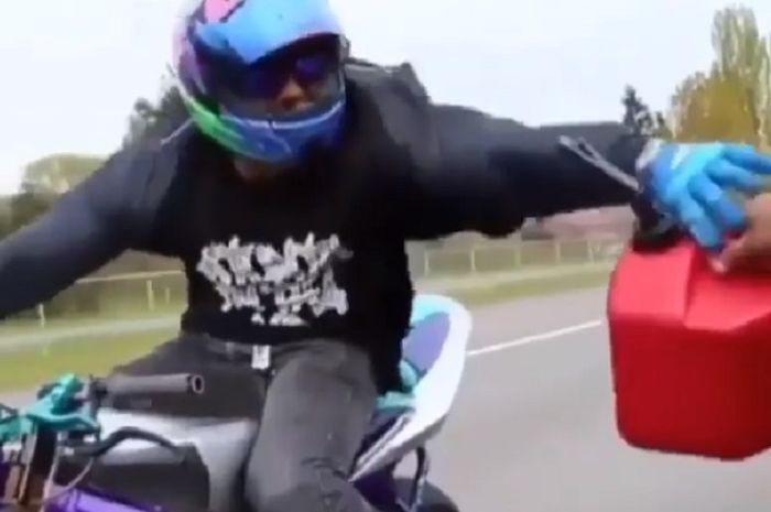 Motor dalam keadaan melaju kencang saat teman si biker ini menyodorkan jerigen berisi bahan bakar.