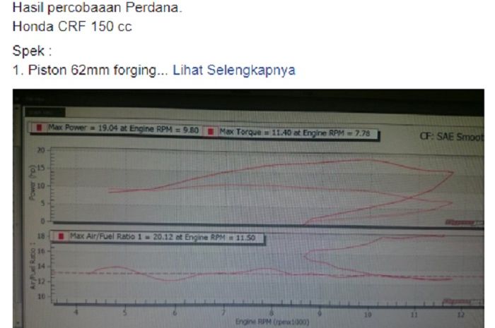 Tomy Huang melampirkan foto grafik dyno tes yang menunjukan power mesin tercatat 19,04 hp.