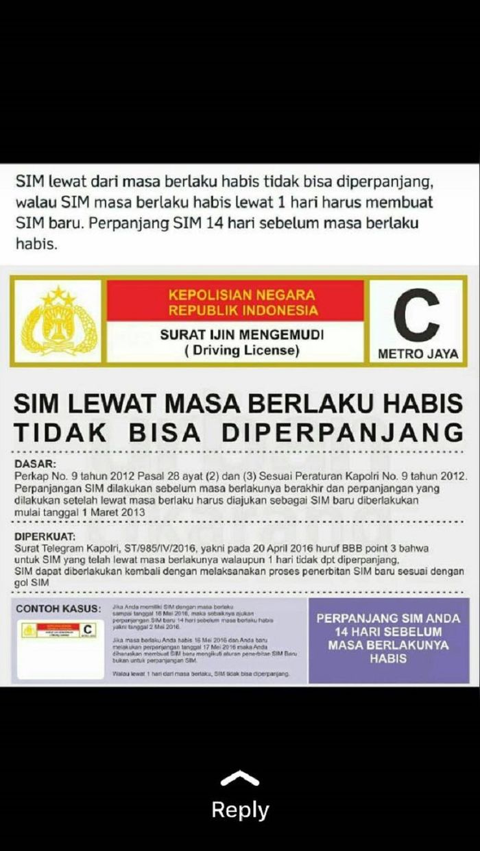 Tidak hanya itu saja, peraturan tersebut ternyata juga diperkuat oleh Surat Telgram Kapolri, ST/985/IV/2016 huruf BBB point 3 bahwa untuk SIM yang telah lewat masa berlakunya walaupun satu hari tidak dapat diperpanjang.