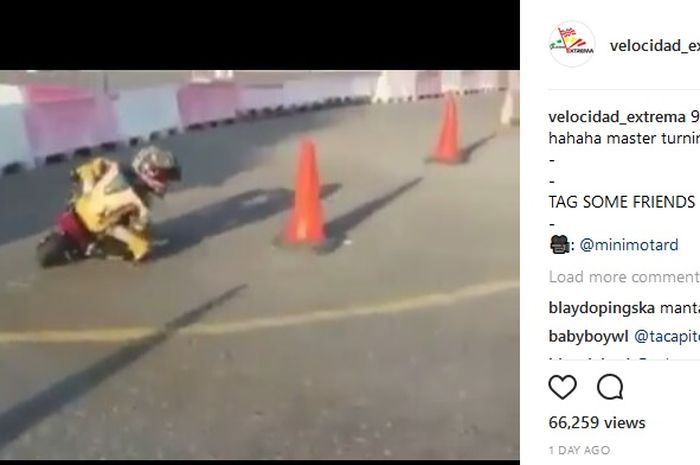 Dalam sebuah posting video yang oleh akun @velocidad_extrema, sang anak tampak enjoy meliuk-liuk dengan motor mini.