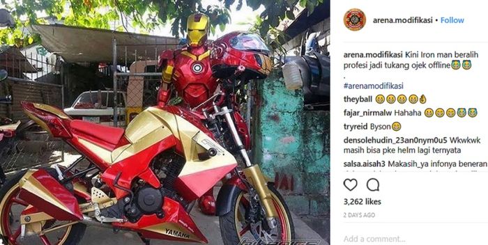 Iron Man 'lokal' ini menunggangi satu unit motor Yamaha Byson dengan kelir hampir sama dengan Iron Man.
