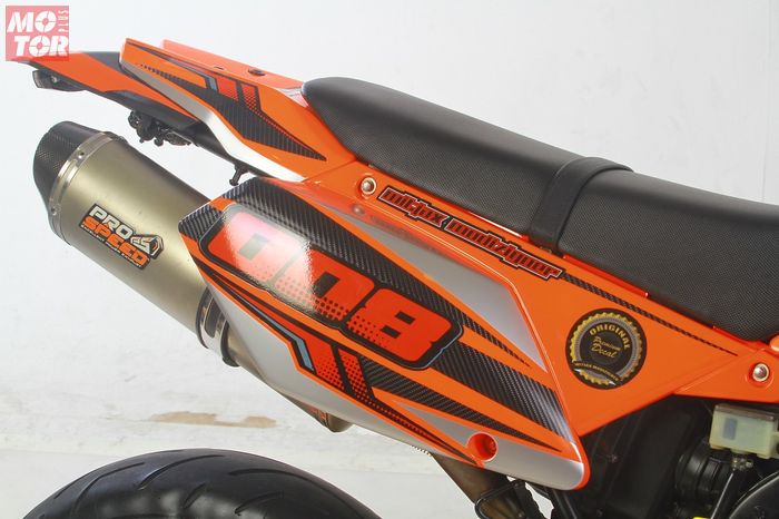 “Hanya sepatbor depan memakai KTM SMR 2012, serta buritan memakai Kawasaki KLX yang disulap jadi model Husqivarna,” jelas pemilik rumah modifikasi di Komplek TU, No. 9, Cipondoh, Tangerang.