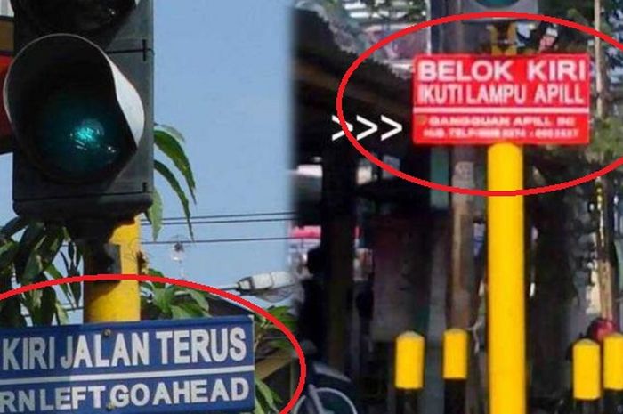Pasalnya, rambu lalu lintas yang berwarna merah meminta untuk mengikuti lampu APILL sedangkan yang berwarna biru memperbolehkan untuk jalan terus.