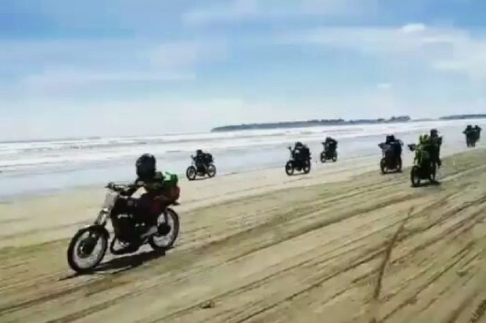 Tapi belasan motor yang dilepas serentak cuma sebagai aksi kebut-kebutan di pantai.