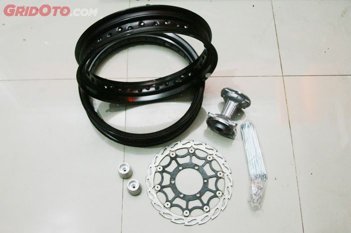 Paket supermoto ini akan dapat pelek TK ukuran 3.00 inci depan dan 3.50 inchi bekalang.