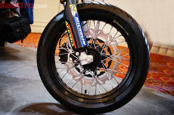 Dengan modifikasi supermoto, motor ini bakal menggunakan roda 17 inci dengan ban on road.