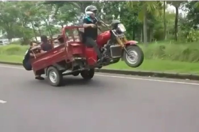 Aksi wheelie di video ini si joki menggunakan motor roda tiga.