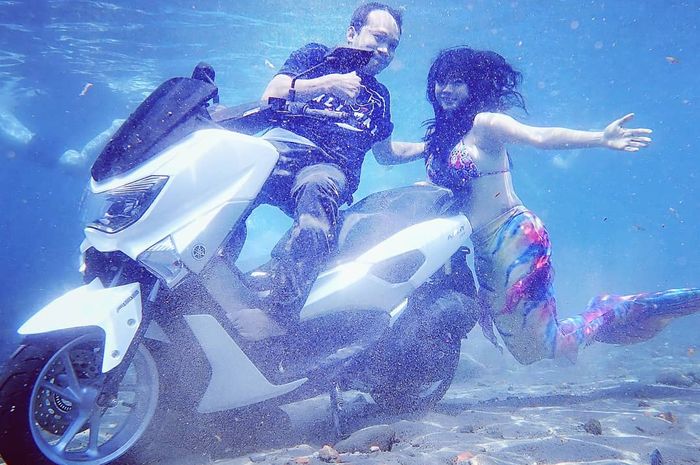 Di foto itu tampak pengendara Yamaha NMAX berpose di dalam air yang didampingi model putri duyung.