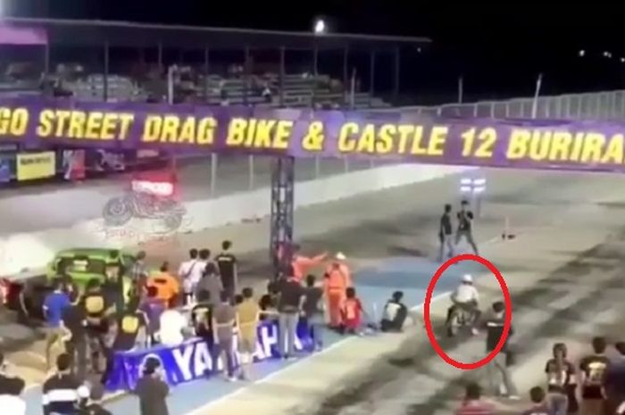 Selepas start, kedua kendaraan super ini powernya setara, namun si mobil melintir lalu menabrak tembok pembatas.