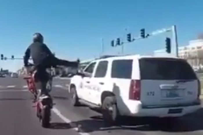 Bikers ini wheelie di sebelah mobil Polisi patroli dan enggak takut terkena masalah.