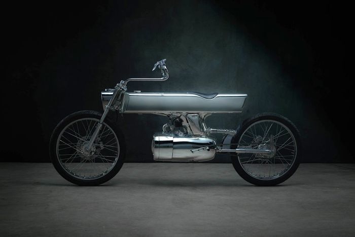 Hanya nampak rangka tengah saja yang memperlihatkan jati diri asli, sedangkan bagian atas serta mesin sudah ditutupi bodi hasil custom.