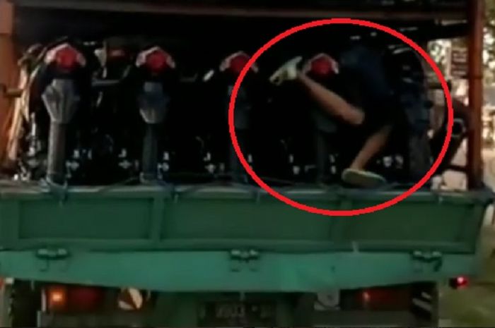Enggak tahunya malah nyolong helm di atas truk pengangkut motor baru.