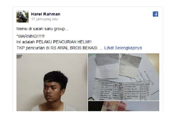 Pelaku pencurian helm oknum siswa SMA ini berhasil tertangkap via info postingan akun Harel Harman di laman Facebook.