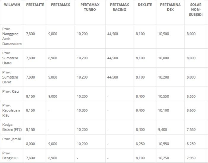 Berikut daftar harga BBM terbaru di seluruh Indonesia yang dikeluarkan oleh Pertamina :