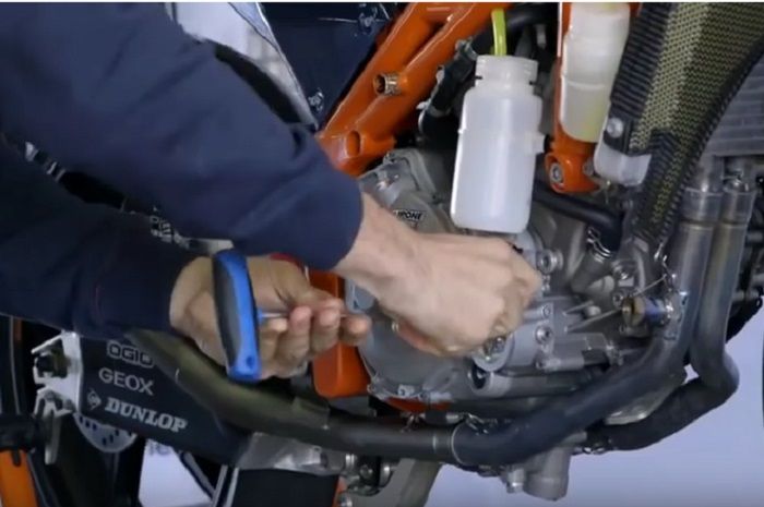 Satu unit motor KTM tengah diganti oli mesinnya oleh seorang mekanik.