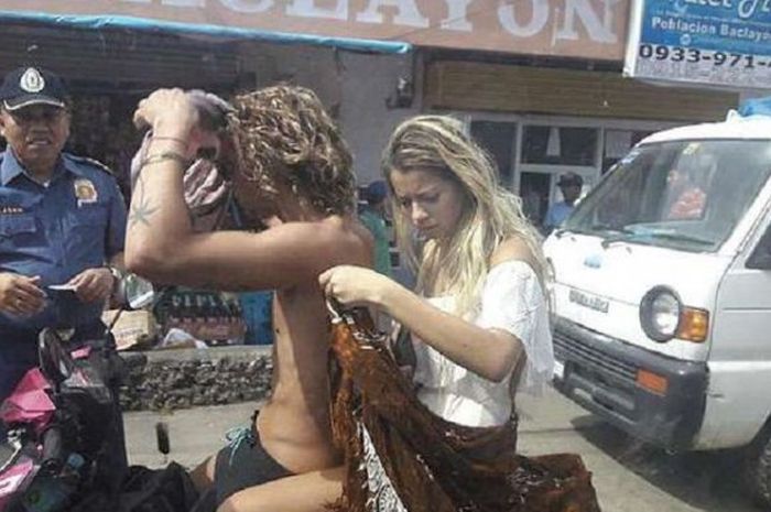 Juru bicara kepolisian Baclayon mengatakan, kedua turis itu diberhentikan dan ditilang karena dianggap melakukan perbuatan tak senonoh.