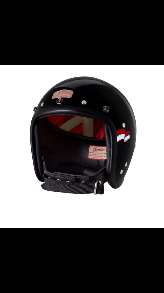Helm Elders Bantam dengan tampilan retro dihias gambar bendera merah putih yang berkibar.