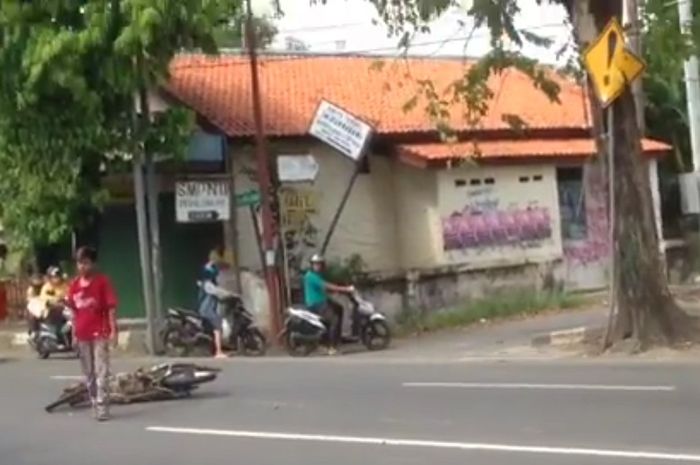Entah terjadi senggolan atau pengendar motor Satria FU kaget ada motor di hadapannya.