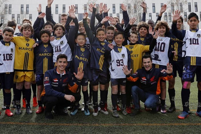 Tak hanya melatih, Marc Marquez dan Dani Pedrosa juga diberi kesempatan bermain bersama anak-anak muda di Spanyol.