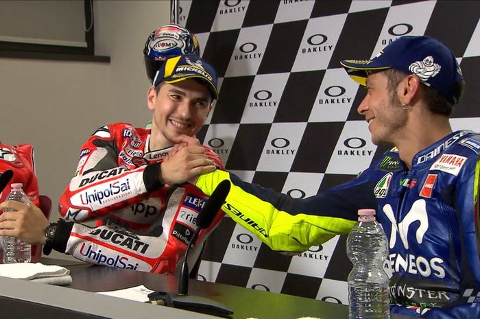 MOTOR Plus-online.com - Valentino Rossi dan Jorge Lorenzo sepertinya lagi mesra dan lagi-lagi pamer kekompakan.