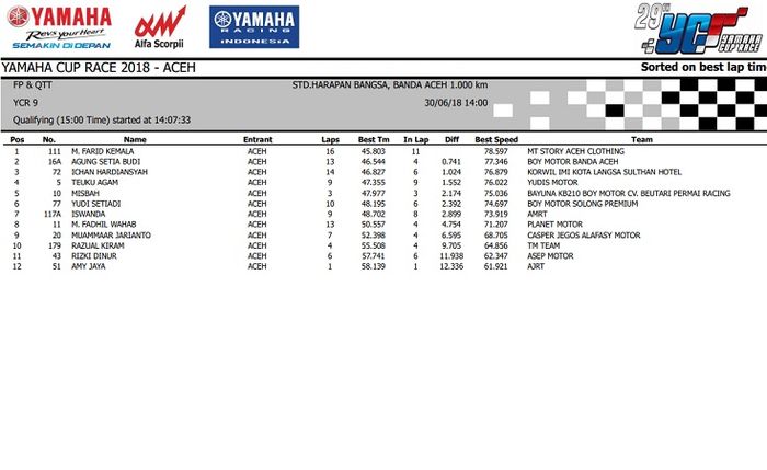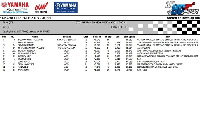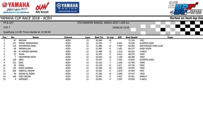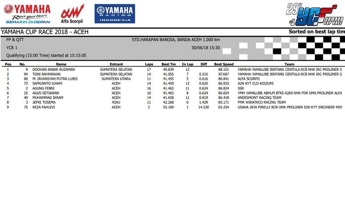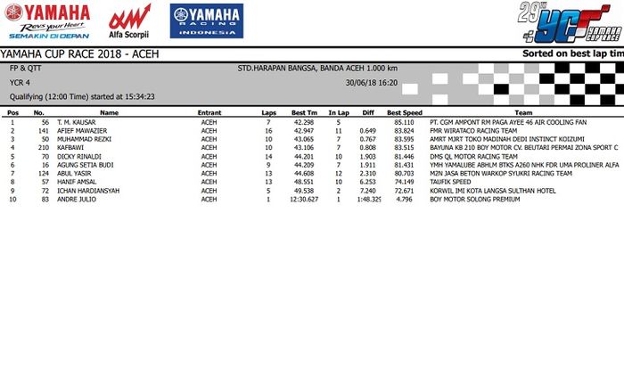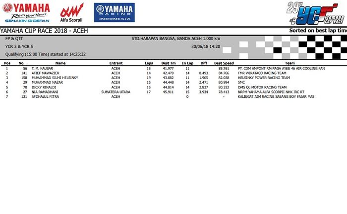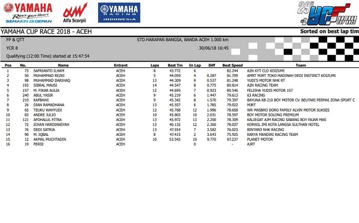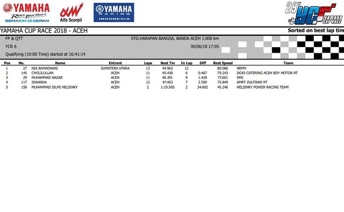 Nah.. Hasil lengkap kualifikasi Yamaha Cup Race seri 3 Aceh ini bisa dilihat di bawah ini.