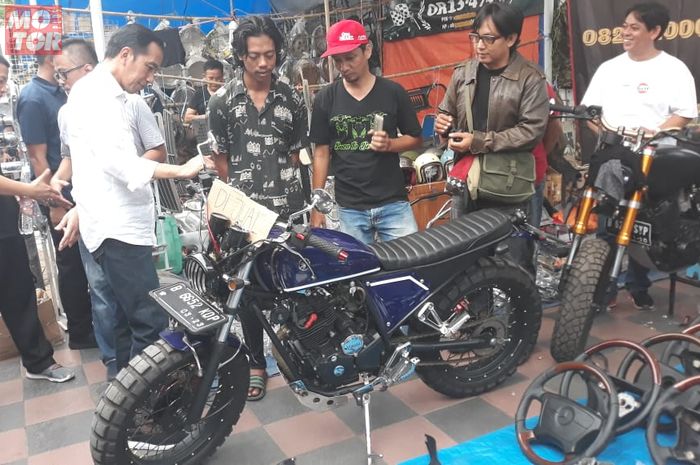 Di booth ini, Jokowi terlihat cukup antusias dengan motor custom Yamaha Scorpio beraliran scrambler milik Diki Darmawan.