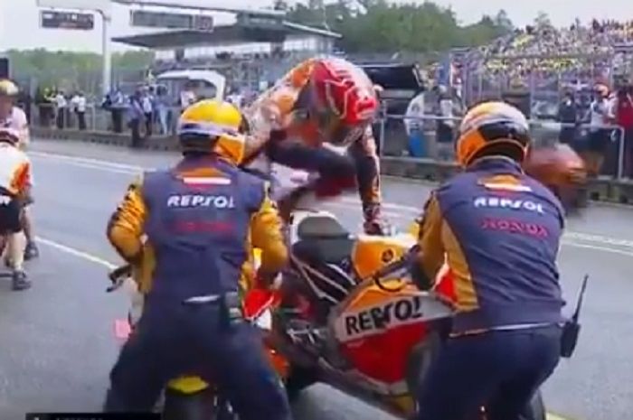 Aksi beraninya melompat dari satu motor ke motor lain ternyata menjadi penentu kemenangan Marquez di Sirkuit Brno.