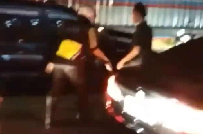 Seorang anggota polisi emosi saat memberhentikan mobil di pinggir jalan.