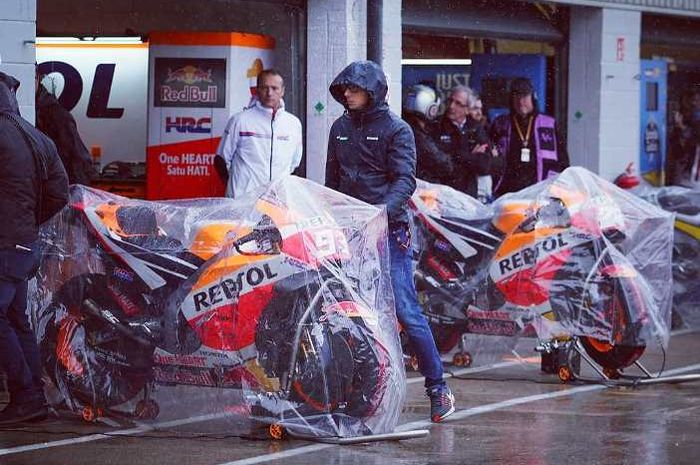 Kurang lebih enam jam pembalap dan kru menunggu hujan reda sampai akhirnya balap urung dilaksanakan.