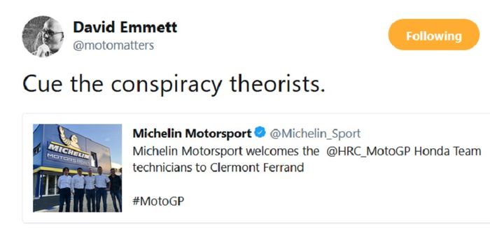 Akun Emmet @motomatters mengomentari foto yang diposting @Michelin_Sport kemarin.