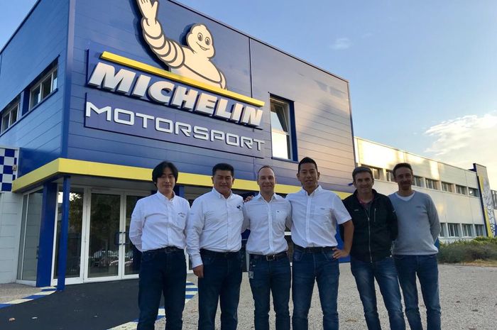 Akun @Michelin_Sport lewat Twitter mengunggah foto bareng Manager Teknik HRC di depan pabrik pusat ban Michelin di Clermont Ferrand, Prancis.