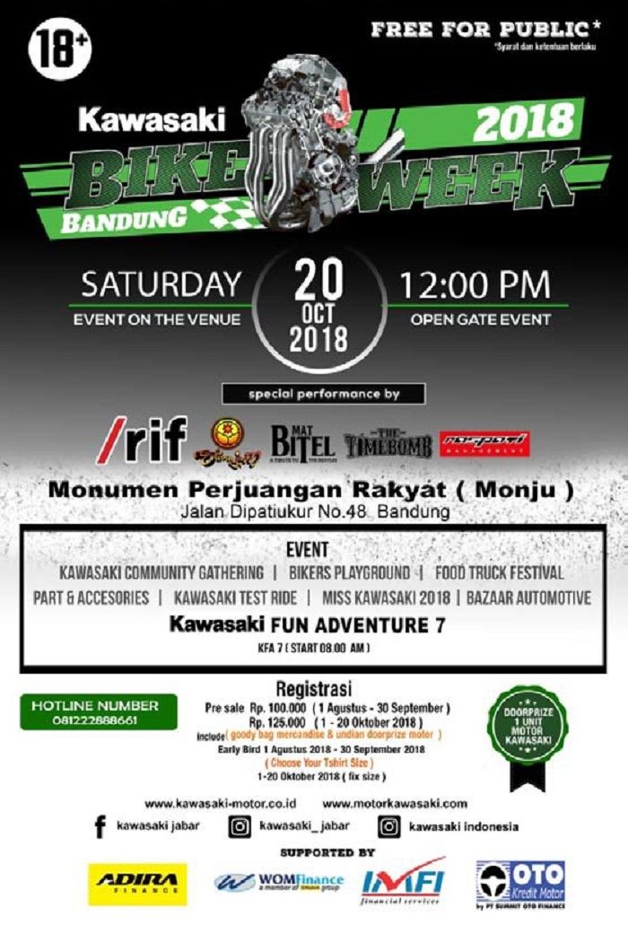 Kawasaki Bike Week 2018 ini akan digelar pada hari Sabtu, 20 Oktober 2018 bertempat di Monumen Perjuangan Rakyat Jawa Barat, Bandung.