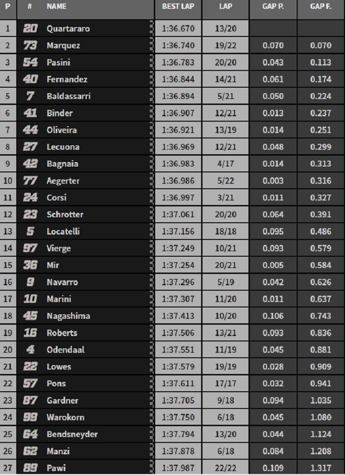 Sampai akhirnya FP3 dikuasai oleh Fabio Quartararo disusul Alex Marquez (2) dan Matia Pasini ke-3.